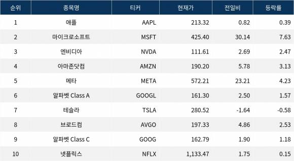 마이크로소프트는 전일 대비 7.63% 상승한 425.40달러로 마감했다. 메타는 4.23% 상승하여 572.21달러를 기록했다. 엔비디아(NVDA)도 2.47% 상승하여 111.61달러에 거래를 마쳤다.