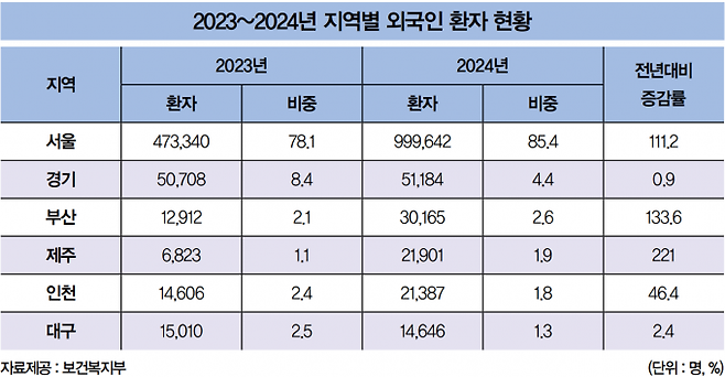 지역별로는 서울이 가장 많았다. 서울을 방문한 외국인 환자는 99만9642명으로 전체의 85.4%를 기록했다. 이 외에 △경기도(4.4%, 5만1184명) △부산(2.6%, 3만165명) △제주(1.9%, 2만1901명) △인천(1.8%, 2만1387명) 순으로 나타났다.