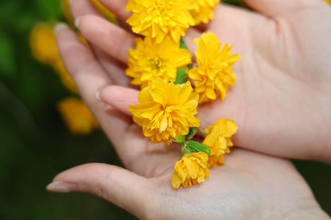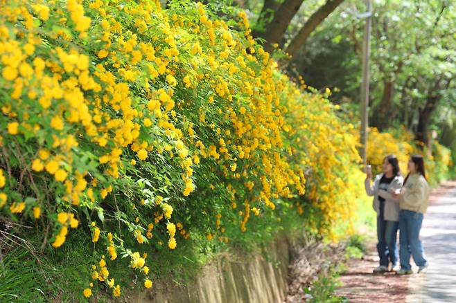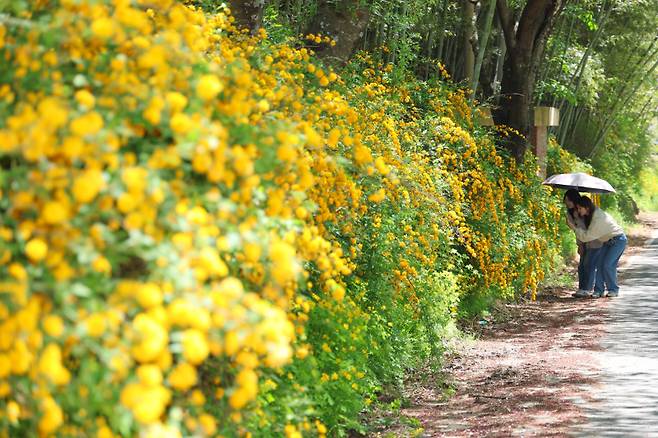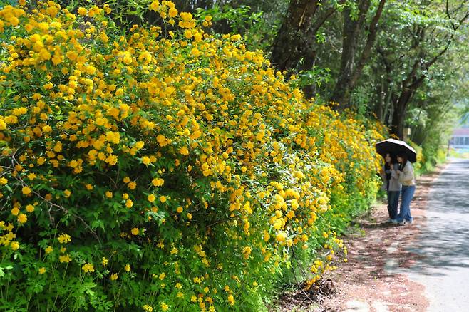 2일 산청군 황매산 입구로 들어서는 만암마을 일원에 황매화 꽃길이 만개해 방문객들의 발길을 사로잡는다.