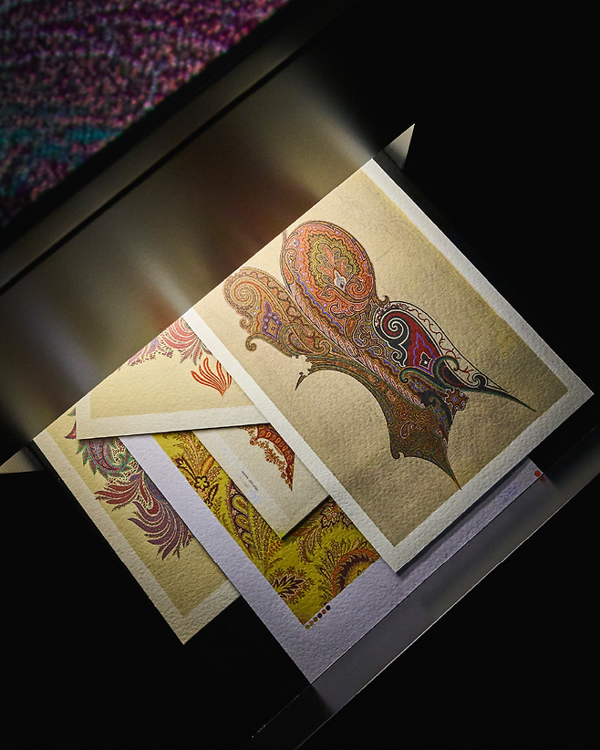 소용돌이치는 곡선과 신비로운 선이 조화를 이루며 마치 물방울이 춤추는 듯한 형상의 페이즐리 패턴은 과거와 현재, 동양과 서양의 경계를 넘나드는 아름다움으로 시선을 사로잡습니다. ‘생명의 나무’를 묘사한 고대 부족 문양에서 유래한 이 패턴은 수백 년 동안 인도의 행운의 상징이었습니다. 하지만 오늘날에는 페이즐리 하면 에트로가 먼저 떠오를 만큼 브랜드의 상징으로 자리를 잡았습니다. 동시에 브랜드의 본질인 세련된 방랑 정신과 육체적·정신적·영적 여정에 대한 끊임없는 열망을 의미합니다. 특히 ‘아르니카’는 에트로의 수많은 캐시미어 패턴과 모티프 중 유일하게 변함없이 계승되어온 디자인이라 그 의미가 더욱 깊죠. 이 아이코닉한 패턴의 40주년을 기념해 밀라노 중심부 폰타치오 거리에 위치한 에트로 부티크에서 헌정 전시회가 열렸습니다.