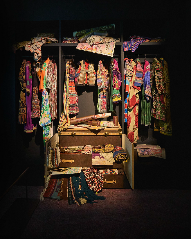 창조 에트로의 뿌리는 정교한 원단에 있습니다. 1980년대 초, 패션과 골동품 수집가이자 열정적인 고대 역사 전문가였던 에트로 창립자 제롤라모 짐모 에트로(Gerolamo Gimmo Etro)가 인도 전통의 페이즐리 패턴을 처음으로 활용한 것이 그 시작입니다. 이 패턴은 모두가 알다시피 에트로를 상징하는 아이콘이 되었죠. 독창적인 제조 과정을 거치는 이 아르니카 패턴은 시즌을 거듭하며 에트로의 의류 컬렉션과 가죽 액세서리 원단에 새로운 생명을 불어넣었습니다. 첫 번째 전시 공간에서는 짐모 에트로가 이러한 작업을 했던 책상과 그가 셀 수 없이 많은 여행을 통해 수집한 책, 직물, 그리고 기억들이 담긴 방대한 아카이브의 일부를 만날 수 있습니다. 즉 형태와 창의성의 끊임없는 흐름 속에 우리가 알고 있는 에트로의 디자인이 탄생한 것을 확인할 수 있죠.