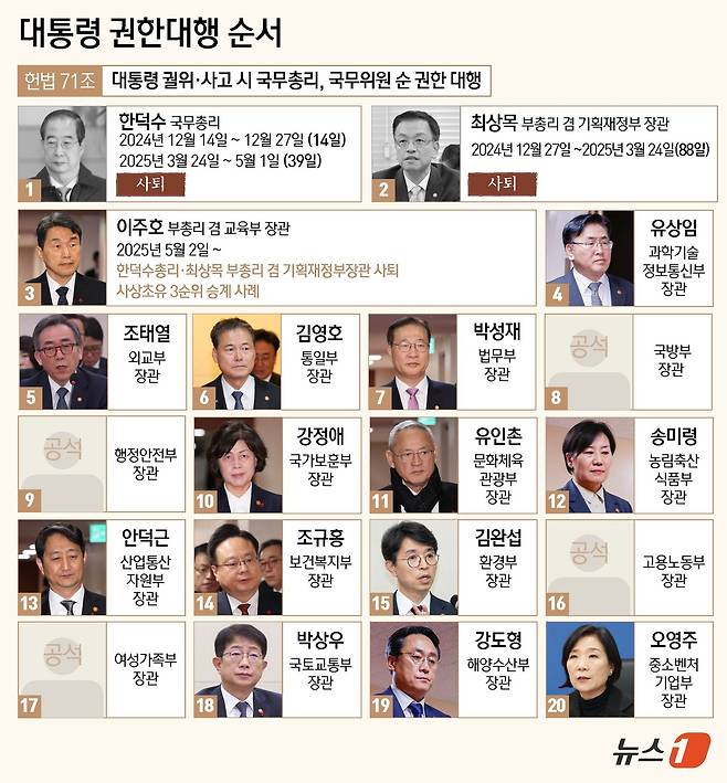 (서울=뉴스1) 윤주희 디자이너 = 한덕수 대통령 권한대행 국무총리가 사퇴한 데 이어 최상목 경제부총리 겸 기획재정부 장관까지 사퇴하면서 이주호 사회부총리 겸 교육부 장관이 2일부터 '대통령 권한대행의 대행의 대행'을 맡게 됐다. 이 권한대행은 이날 오전 0시 이후 전 정부 부처와 공직자를 대상으로 안보·외교·치안·선거관리·경제 등에 대한 긴급 지시를 시달하며 업무를 시작했다.