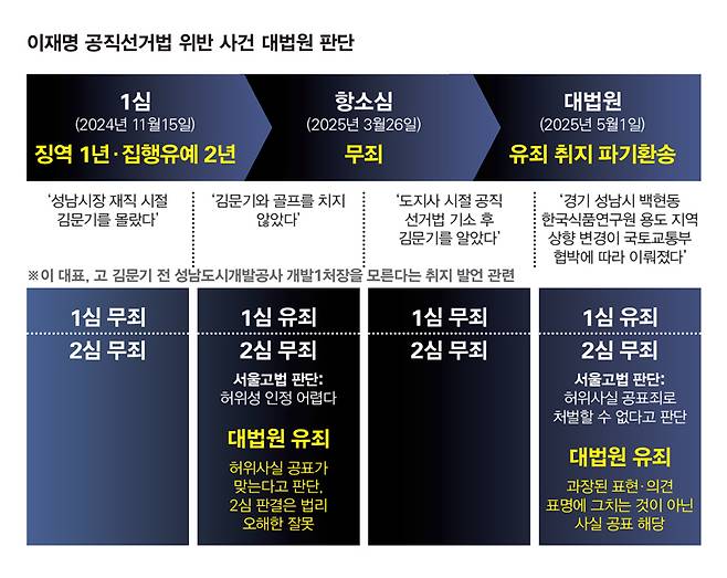 대법원 전원합의체는 5월1일 공직선거법상 허위사실 공표 혐의로 기소된 이 후보의 상고심에서 2심 무죄 판결을 뒤집고 유죄 취지로 파기환송해 사건을 서울고등법원으로 돌려보냈다. 대법원은 원심(2심)이 △고(故) 김문기 관련 골프 발언 △백현동 관련 '국토부의 협박이 있었다'는 발언의 의미를 잘못 해석했고, 잘못 해석된 의미를 전제로 허위사실 공표죄의 성립 여부를 따져 공직선거법 제250조 1항이 규정한 법리를 오해했다고 결론 냈다. 조희대 대법원장과 전원합의체에 참여한 대법관 9명이 '파기환송' 다수의견을, 이흥구·오경미 대법관은 이에 반대하는 소수의견을 냈다.