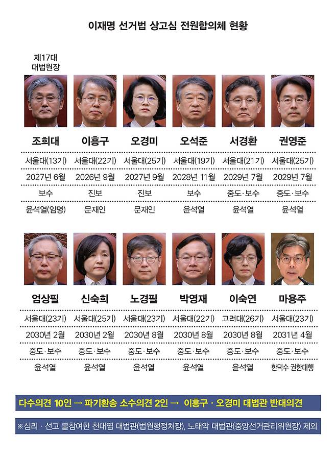 이 같은 속도는 전원합의체 재판장인 조희대 대법원장의 강력한 의지가 반영된 것이란 평가다. 조 대법원장은 사건이 소부에 배당된 당일인 4월22일 직권으로 전원합의체에 회부했고, 당일 곧바로 합의기일까지 진행했다. 이틀 후인 4월24일 두 번째 합의기일을 열었고 표결까지 진행, 이로부터 8일 후인 5월1일로 선고기일을 확정했다.