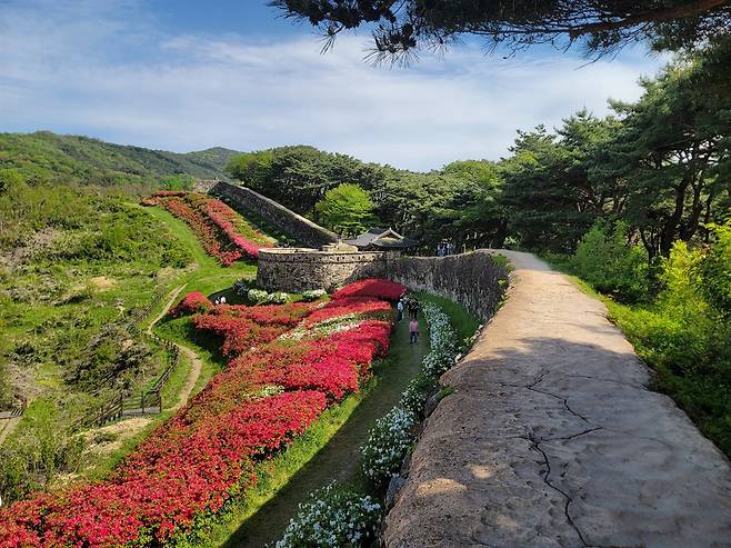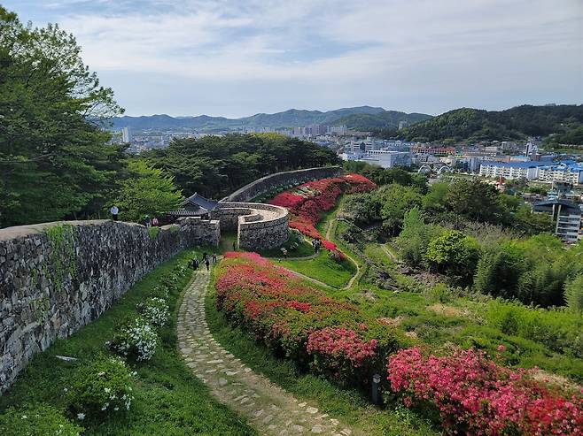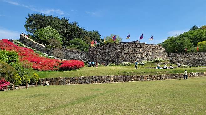 | ▲ 고창읍성 성곽과 옹성(성문 안밖을 둘러싼 구조물), 치성 (성벽을 보강하기 위해 덧쌓은 벽) 주위에 영산홍이 만개 |