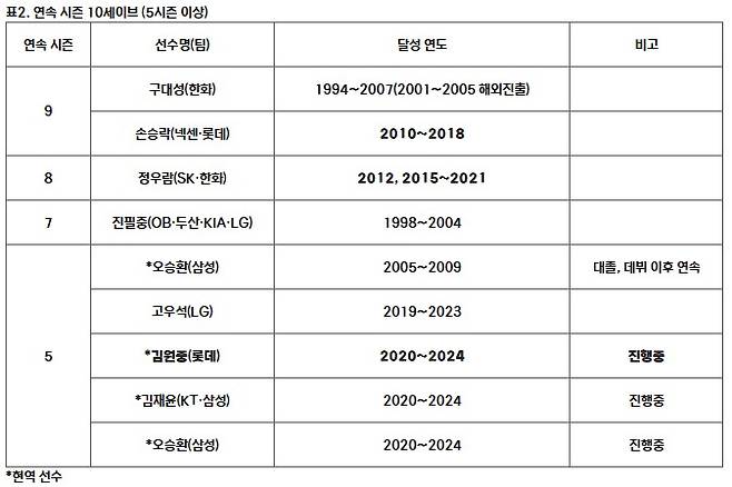 앞으로 김원중이 세이브 1개만 추가한다면 KBO리그 역대 5번째로 6시즌 연속 10세이브를 달성하게 된다.