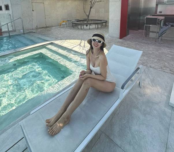 그는 “배 안에 뽈록 존재감 뽐내는 둥이들과 가족들과 부산에 내려왔다”면서 가족들과 함께 수영장, 욕조에서 물놀이하며 찍은 사진도 공개했다. 사진 속 그는 아름다운 D라인을 뽐내며 수영복 자태를 자랑했다.