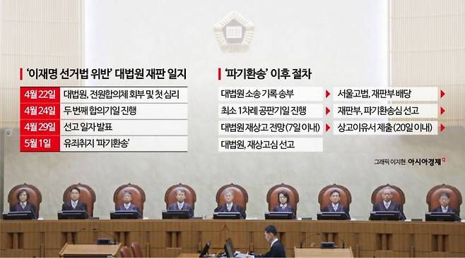 대법원이 이재명 더불어민주당 대선 후보의 공직선거법 위반 사건을 유죄 취지로 서울고법에 파기환송하면서 앞으로 절차에 관심이 집중되고 있다. 서울고법은 선거 전담재판부에 파기환송심 재판을 배당하게 되고 이 재판에서는 유죄 결론하에서 이 후보에 대한 선고 형량을 정하게 된다. 그 이후 재상고가 이뤄진다면 대법원의 확정 절차가 이어지게 된다. 그 과정에서 '사법'과 '정치'의 충돌이 계속되면서 갈등이 첨예화될 것이라는 전망이 나온다.