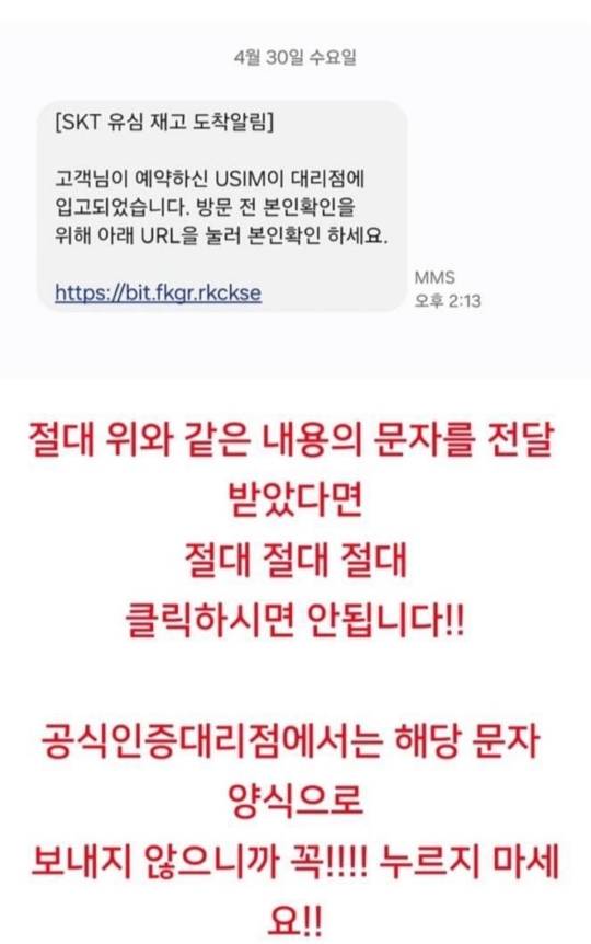 Q. SK텔레콤에서 유심 재고가 도착했다는 알림 문자가 오던데 유심 교체 하러가면 되는지? - 이번 사고를 악용한 스미싱 문자에 대한 주의가 필요하다. URL 링크가 포함된 안내 문자는 누르지 말아달라. SK텔레콤에서 보내드리는 안내 문자의 발신번호는 114다. 발신자명(SK텔레콤)과 발신번호를 꼭 확인해주길 바란다.
