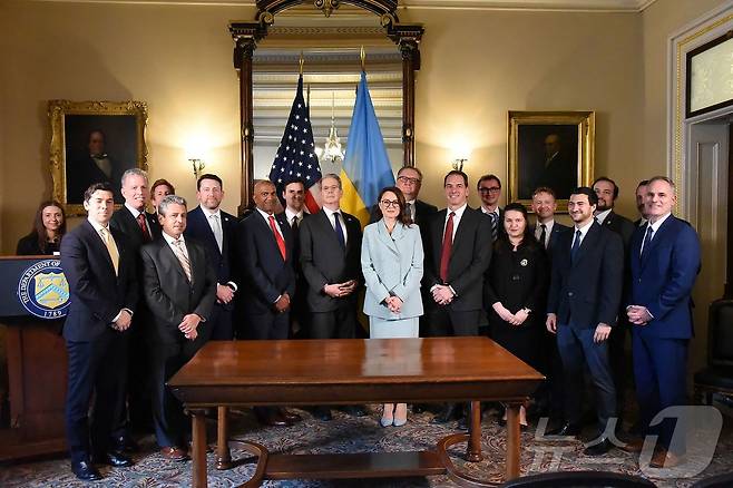 (워싱턴 AFP=뉴스1) 우동명 기자 = 스콧 베선트 미국 재무장관과 율리아 스비리덴코 우크라이나 제1부총리 겸 경제장관이 1일(현지시간) 워싱턴 재무부에서 광물협정에 서명을 한 뒤 포즈를 취하고 있다. 2025.05.02