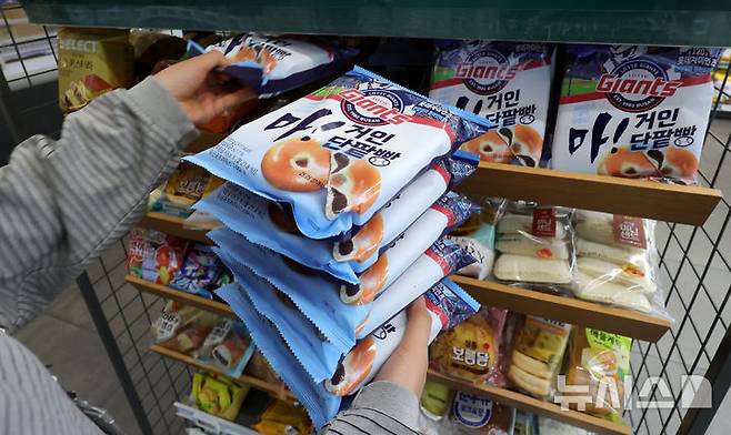 [서울=뉴시스] 홍효식 기자 = 롯데 계열 편의점 세븐일레븐이 롯데웰푸드와 손잡고 프로야구 롯데 자이언츠 팬을 위한 롯데빵을 출시한 2일 서울 시내 세븐일레븐 편의점에서 한 시민이 '마! 거인 단팥빵'을 몽땅 구입하고 있다. 2025.05.02. yesphoto@newsis.com