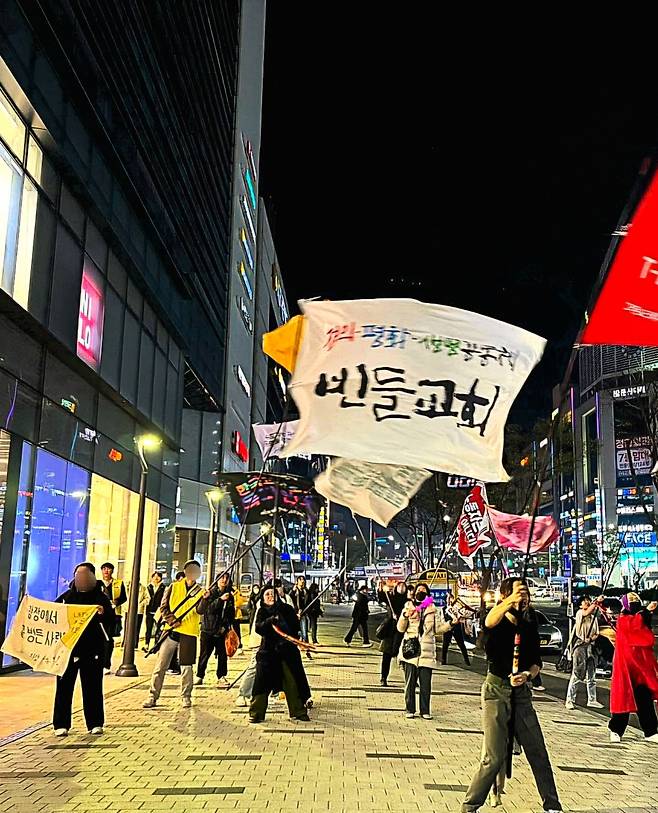 | ▲ 새로 나가게 된 교회의 깃발을 흔드는 묵음. 대전은 집회가 끝난 후 노래 세 곡을 함께 즐기는 뒷풀이를 한다. |