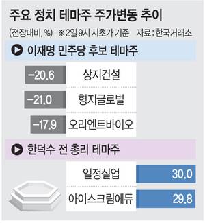 정치 테마주 ‘요동’… 이재명 21% ↓·한덕수 30% ↑