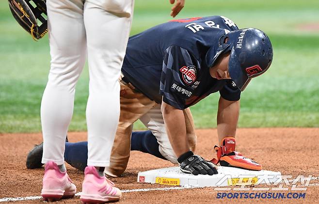 롯데는 1회 2득점 후 계속된 1사 만루 찬스에서 추가점을 뽑지 못했다. 3회 1사 1, 3루의 기회도 살리지 못했다. 2-0의 불안한 리드. 4회초 2사 3루, 황성빈의 타구가 유격수 방면으로 향했다. 쉽게 아웃 처리될 타구였다. 하지만 '마황'아닌가. 사력을 다해 1루로 뛴 황성빈이 몸을 던졌고 공보다 빨리 베이스를 터치했다. 3루주자 전준우의 득점. 3-0으로 롯데가 점수를 벌렸다.