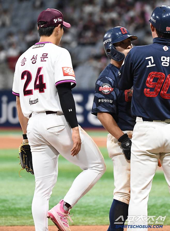 3루수 송성문이 뒤에서 황성빈의 엉덩이를 향해 니킥을 날린 이유다.
