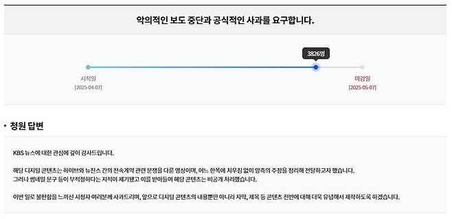 앞서 KBS는 지난달 7일 소속사 어도어와 뉴진스의 갈등과 관련한 유튜브 영상 썸네일에 '탈출은 지능순'이라는 문구를 넣었다. 이에 해당 문구가 자극적이라며 비판이 제기됐고, 한 누리꾼은 불만을 제기하는 청원글을 올렸다. 해당 청원은 이날까지 3800명 이상의 동의를 얻고 있다.