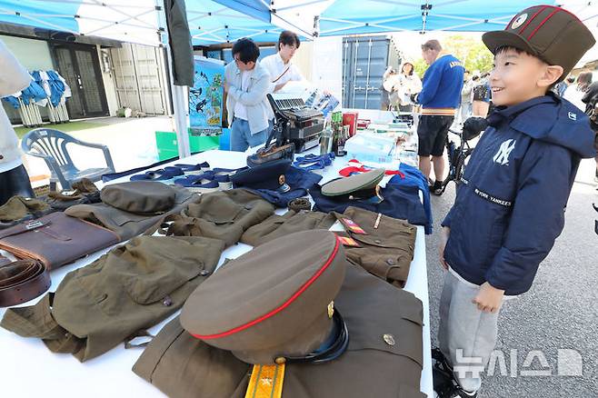 [서울=뉴시스] 김혜진 기자 = 2일 오후 서울 성동구 서울숲 언더스탠드에비뉴에서 열린 북한인권 체험형 전시프로그램 'ZOOM IN 2.0X'에서 한 어린이가 북한군 모자를 써 보고 있다. 2025.05.02. jini@newsis.com