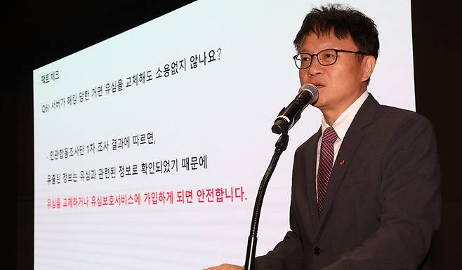 ▲ 류정환 SK텔레콤 부사장이 2일 서울 중구 SKT타워에서 열린 유심 정보 유출 관련 일일 브리핑에서 서버 해킹 관련 내용에 대해 답변하고 있다.