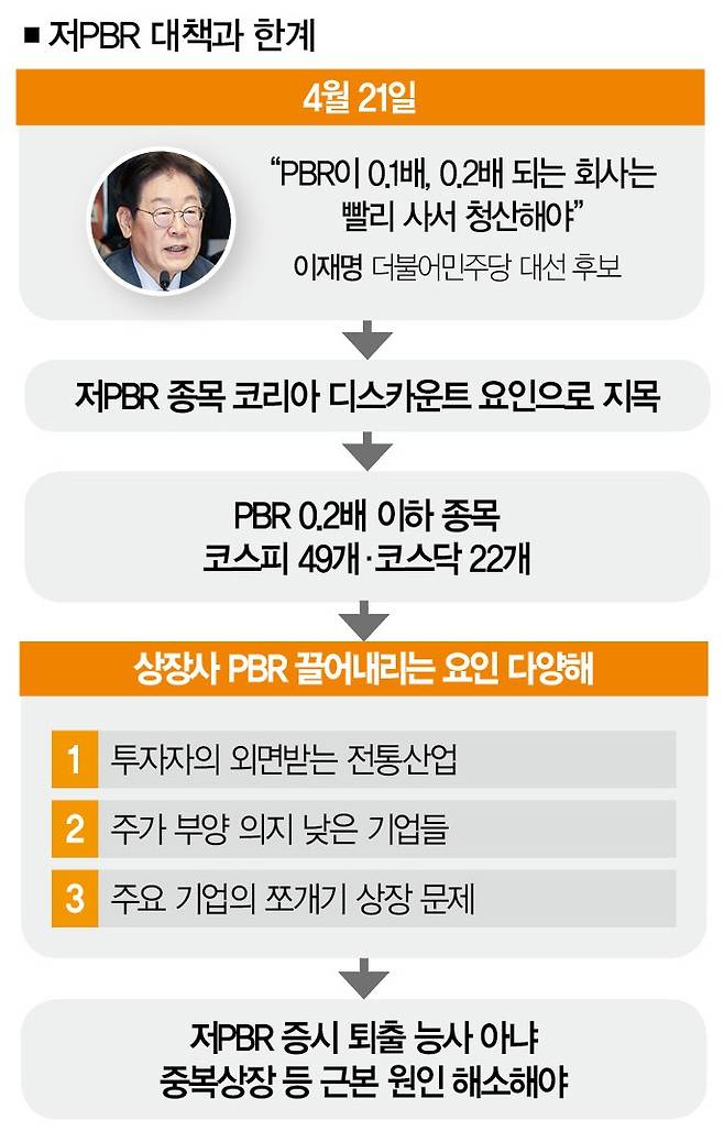 국내 증시의 저평가 논란이 다시 들끓고 있다. 주가순자산비율(PBR)이 0.2배 미만인 상장사는 증시에서 퇴출해야 한다는 주장이 제기되면서다. 논란의 발단은 4월 28일 더불어민주당 21대 대선 후보로 선출된 이재명 후보의 말이었다.