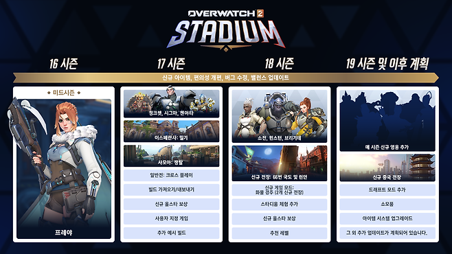 세부적으로 16시즌 미드시즌 패치를 통해 영웅 프레야가 스타디움 첫 신규 영웅으로 추가될 예정이다. 또한 스타디움에 신규 게임 모드 '화물 경주'와 함께 신규 전장 2종도 함께 선보인다.