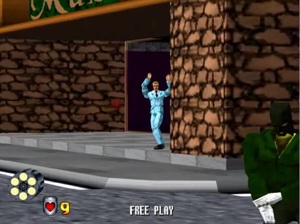 검떠: '버추어 캅'는 어떤 면에선 인질들 때문에 사리가 나올 정도로 빡치기 쉬운 게임이죠. 무슨 장난하는 것도 아니고 갑자기 불쑥 튀어나오는데 알고보니 인질이에요! 무심코 총을 쐈다간 하트 하나 날리기 십상이죠.. 인질이 왜 갑자기 손을 들고 몸을 일으키고 난리야!! 하아..