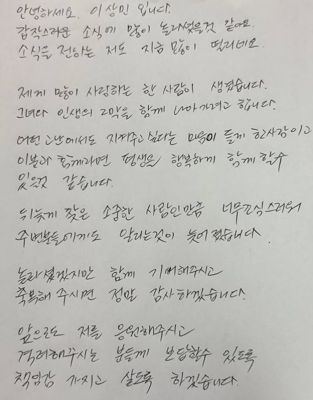 이상민은 “뒤늦게 찾은 소중한 사람인 만큼 너무 조심스러워 알리는 게 늦어졌다"며 "함께 기뻐해주시고 축복해주시면 정말 감사하겠다"고 말했다.
