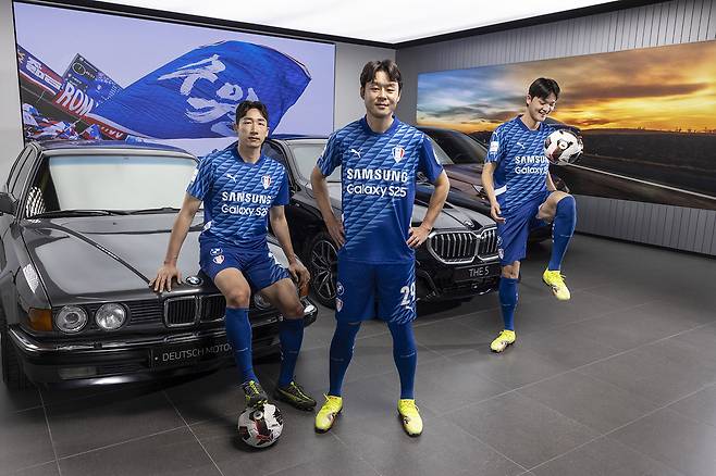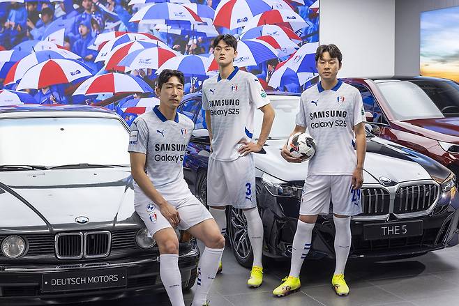 이 셋은 각기 다른 시기를 대표하면서도 같은 푸른 유니폼을 입고 하나의 팀으로 서 있는 모습으로 지난 30년간 단절 없이 이어져온 블루윙즈의 역사를 시각적으로 표현했으며 BMW의 차량 세 대도 함께 등장하여 유니폼과의 조화를 더했다. 창단 시절의 감성을 담은 1990년대 클래식 BMW 735iL, 현재의 BMW를 가장 대표하는 5시리즈 i5, 그리고 지속 가능한 미래를 상징하는 순수 전기차 iX M60까지, 수원의 30년을 자동차라는 상징물로 풀어내며 레트로 유니폼의 의미를 더욱 풍성하게 했다.