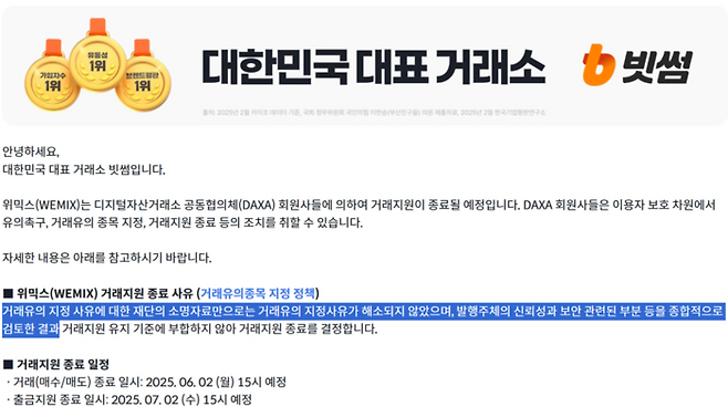 2일 디지털자산거래소 공동협의체(DAXA)는 위믹스의 거래지원을 종료한다고 밝혔다. 다음달 2일 15시 국내 가상자산 거래소인 빗썸, 코인원, 코빗, 고팍스에서 상장폐지될 예정이다.