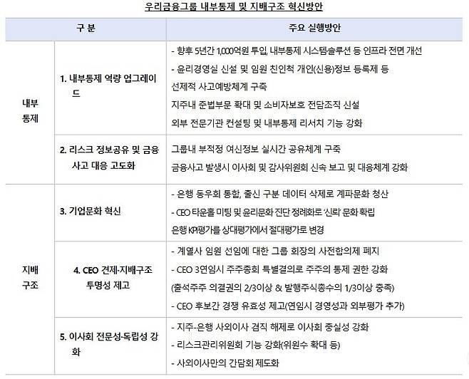 우리금융은 혁신 방안의 추진을 위해 향후 5년간 내부통제 인프라 구축에 1000억원 규모 자금 투입을 결정했습니다.