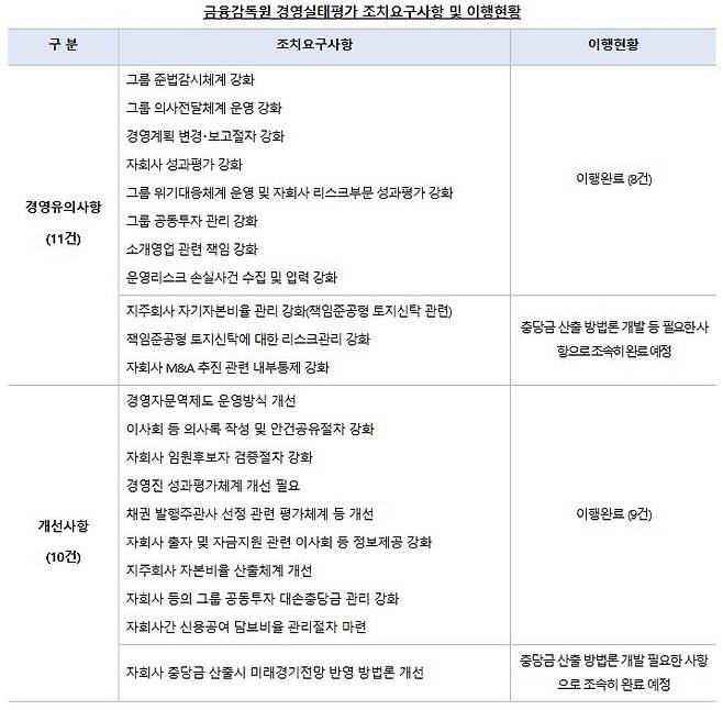 "금감원 경평 조치사항 21건 중 17건 이행 완료"