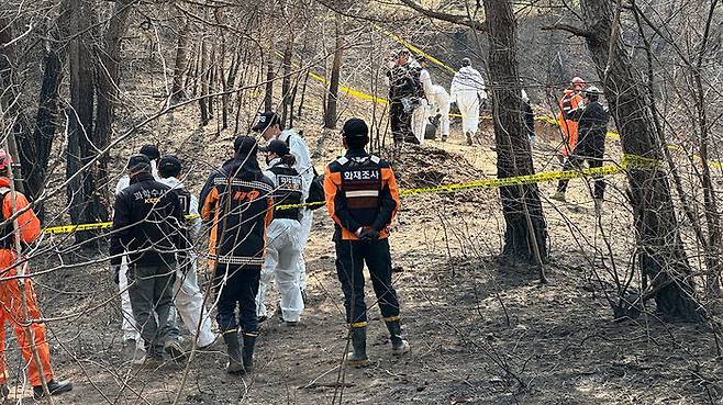 ▲ 지난 3월 31일 경북 산불 최초 발화지로 지목된 의성군 안평면 괴산리 산불 발생 현장에서 소방 당국과 국립과학수사연구원 등이 합동 감식을 하고 있다.
