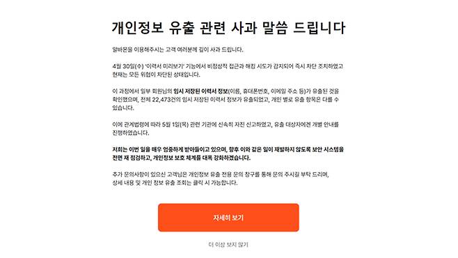 알바몬은 홈페이지에 지난달 30일 이력서 미리보기 기능에서 비정상적 접근과 해킹 시도가 감지됐다며 일부 회원들의 임시 저장 이력서 정부가 유출된 것을 확인했다고 공지했습니다.