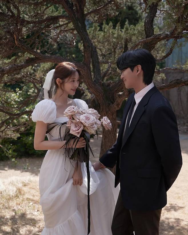 서동주는 러블리한 분위기의 웨딩드레스를 입고 예비신랑을 바라보고 있다. 예비신랑 역시 서동주와 눈을 맞추며 미소 짓는다. 아름다운 서동주와 훤칠한 예비신랑의 모습이 눈길을 끈다.