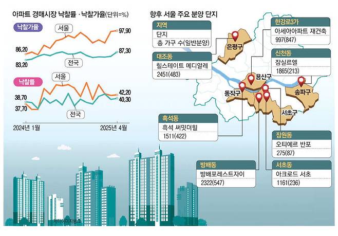 실제로 서울 아파트 경매시장은 최근 들어 다소 회복된 모습이다. 법원경매 전문회사 지지옥션에 따르면 올해 4월 서울 아파트 경매 낙찰가율(감정가 대비 낙찰가격 비율)은 97.9%를 기록했다. 지난해 10월 97.0%까지 오른 뒤 11월 94.9%, 12월에는 탄핵 정국 여파로 91.8%로 떨어져 올 2월까지 저조한 흐름을 보이다가 두 달 연속 다시 낙찰가율이 상승한 것이다.