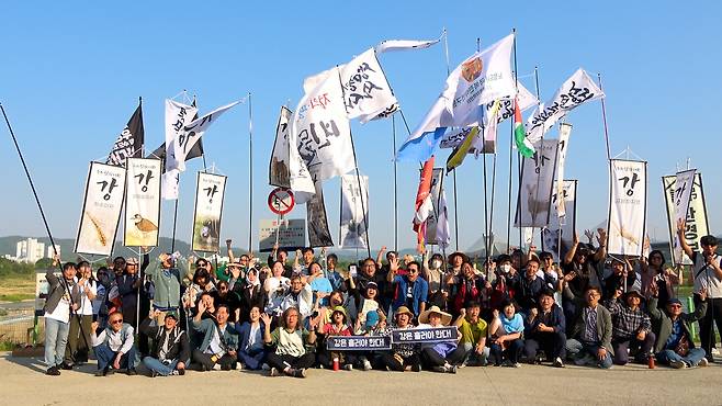 | ▲ 세종보 천막농성 1년 투쟁문화제에 참가한 환경운동가들이 세종보 앞에서 기념촬영을 하고 있다 |