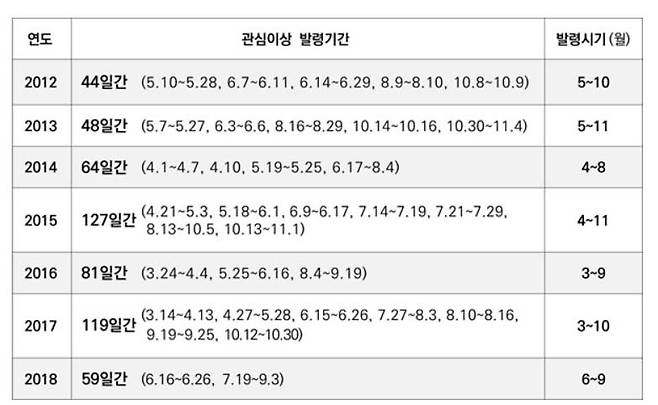 | ▲ 충남연구원이 제시한 녹조 발령 상황 |