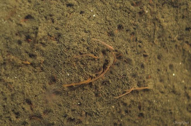 | ▲ 24일 오전 충남 세종시 금강 세종보 하류에 있는 마리나 선착장에 실지렁이가 보이고 있다. 실지렁이는 환경부가 정한 환경오염 최하위 등급인 4등급 지표종이다. |
