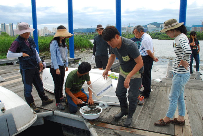 | ▲ 세종시청 건너편 마리나 선착장에서 저질토 분석과 실지렁이, 깔따구 개체 수 확인을 하고 있다. |