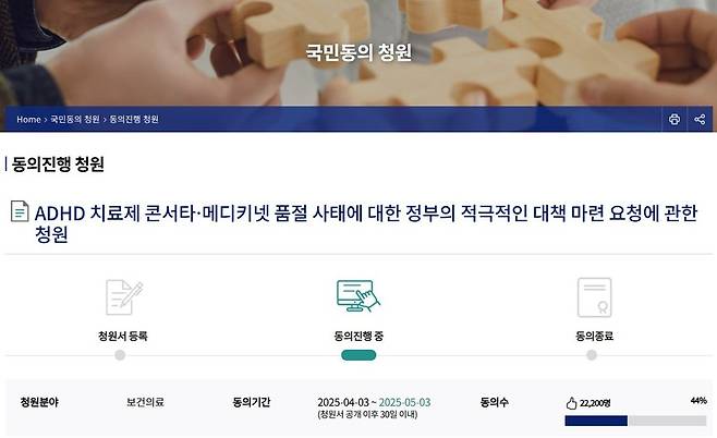 [지난달 3일 ADHD 치료제 품절 사태에 대한 정부의 대책 마련을 요청하는 내용의 국민동의청원이 게재됐다. (사진=국회전자청원 홈페이지)]
