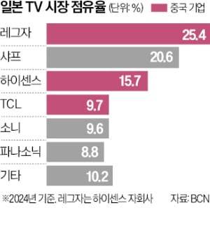 시장조사업체 BCN에 따르면 일본 TV 시장에서 중국 브랜드 점유율은 지난해 처음 50%를 돌파했다. 레그자가 25.4%로 1위를 차지한 데 이어 하이센스(레그자 제외·15.7%)와 TCL(9.7%)이 3, 4위에 올랐다. 일본 샤프가 20.6%(2위)로 체면치레를 했을 뿐 소니(9.6%)와 파나소닉(8.8%)은 5, 6위로 밀렸다.