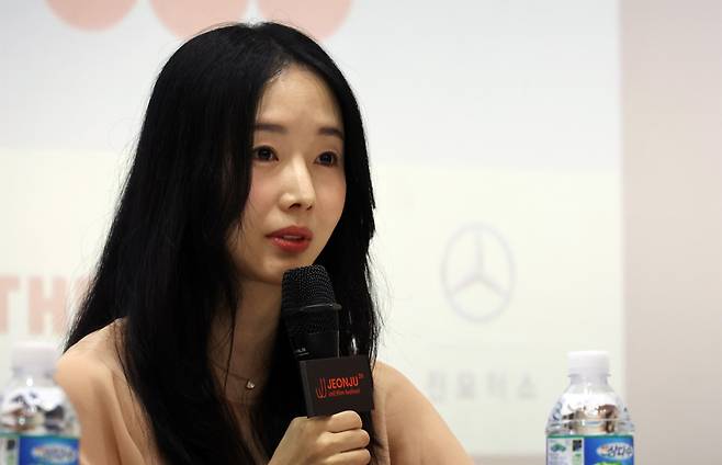 | ▲ 제26회 전주국제영화제가 열리고 있는 2일, 전북 전주시 완산구 전주중부비전센터에서 개최된 'J스페셜: 올해의 프로그래머' 기자회견에서 배우 겸 감독 이정현이 기자들의 질문에 답하고 있다. |