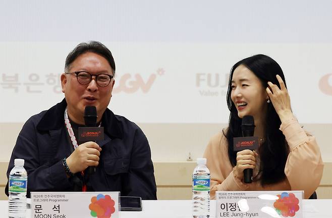| ▲ 제26회 전주국제영화제가 열리고 있는 2일, 전북 전주시 완산구 전주중부비전센터에서 개최된 'J스페셜: 올해의 프로그래머' 기자회견에서 배우 겸 감독 이정현과 문석 프로그래머가 대화하고 있다. |