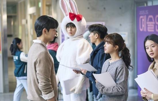 그런 가운데 황재열의 간절한 눈빛에도 시선 하나 주지 않는 바니의 모습이 포착돼 시선을 끈다. 공개된 사진 속 황재열은 평소라면 입지 않았을 토끼 인형탈을 쓴 채 둘만의 세계에 빠진 바니와 차지원(조준영)을 하염없이 바라보고만 있다. 그는 예술제 홍보를 위해 귀여운 탈까지 썼지만 바니의 행동 하나하나에 레이더를 기울이느라 표정관리조차 제대로 하지 못하는 상황. 설상가상 뒤도 돌아보지 않고 어디론가 가버리는 바니의 뒷모습을 애처롭게 응시하고만 있어 황재열의 애타는 마음이 느껴진다.