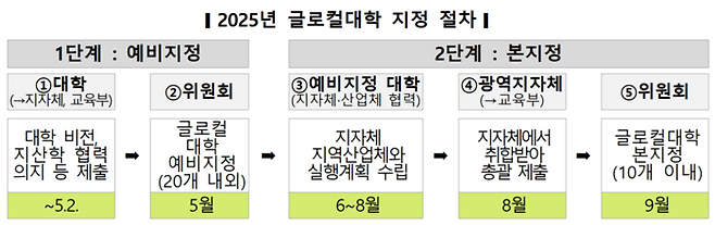 앞서 교육부와 글로컬대학위원회는 지난 3일 '2025년 글로컬대학 지정 계획'을 확정·발표했다. 참여할 대학의 예비지정 신청서(혁신기획서)를 2일까지 접수받았고, 5월 내 예비지정 결과를 발표한다. 예비지정 대학과 공개에 동의한 대학 혁신기획서는 교육부 누리집을 통해 공개한다.