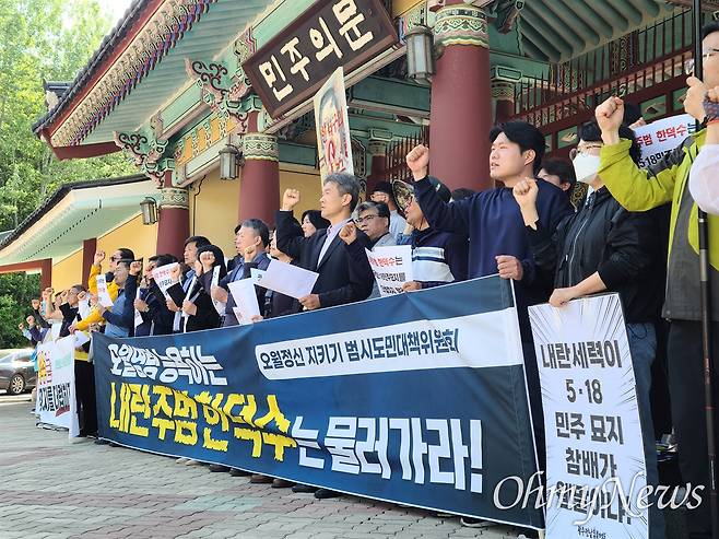| ▲ ‘내란청산·사회대개혁 광주비상행동’은 2일 광주 북구 운정동 국립 5·18민주묘지 앞에서 기자회견을 열고 “내란주범 한덕수의 5·18민주묘지 참배는 광주와 민주주의에 대한 능욕”이라고 규탄했다. 한 전 권한대행은 이날 오전 국회에서 대통령 선거 출마 선언을 하고 오후엔 광주 방문을 예고했다. 2025. 5. 2 |