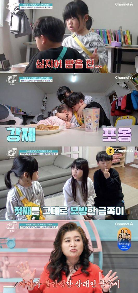 급기야 막내가 넘어뜨려 울리기까지 했다. 그러자 셋째는 막내를 안아주고 달래며 ‘병 주고 약 주는’ 모습을 보였다. 또 금쪽이는 자신의 말을 안 듣는 2살 터울인 넷째 동생을 때리고 구석으로 몰고 압박하기도 했다. 결국 누나에 눌려 눈물이 터진 넷째. 그리고 그 모습을 지켜본 막내 역시 덩달아 무서움에 울음을 터트렸다.