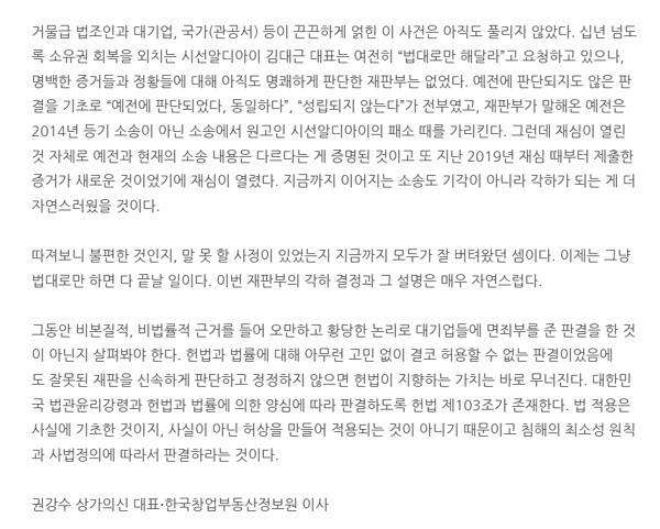 | ▲ 권강수 상가의신 대표이자 한국창업부동산정보원 이사는 지난 4월 1일 <세계비즈>에 기고한 칼럼에서 "그동안 비본질적, 비법률적 근거를 들어 오만하고 황당한 논리로 대기업들에 면죄부를 준 판결을 한 것이 아닌지 살펴봐야 한다"라고 일갈했다. |