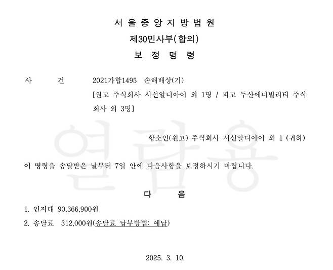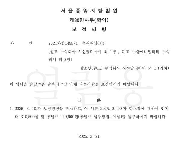 위와 아래는 서울중앙지법 제30민사부(합의)가 두산중공업(2022년 두산에너빌리티로 사명 변경)과 소유권 다툼을 벌이고 있는 시선RDI와 김대근 대표에게 내린 '보정명령(補正命令)'이다. 보정명령이란 법원이 소송을 제기한 당사자에게 부족하거나 잘못한 부분을 보충하거나 고치라고 내리는 명령으로 불응하면 재판에서 불이익을 받을 수 있다.