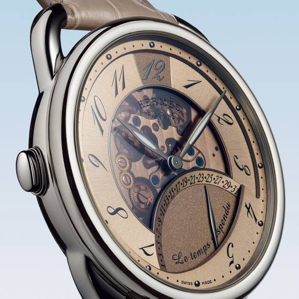 제네바에서 열린 ‘2025 워치스 앤 원더스’ 에서 에르메스는 르 땅 서스팡뒤의 독특하고도 시적인 의미를 효과적으로 전하기 위해 비주얼 아티스트 사라-아나이스 데브누아(Sarah-Anaïs Desbenoit)에게 부스를 맡겼다. 인공적 햇빛이 새벽과 황혼을 교차하며 흐르고, 둥근 창문을 통해 건축적 형태가 나타났다 사라지며 빗방울 소리와 신호등 알람 소리, 뭉뚱그린 사람들의 대화 소리 등이 은은하게 들리는 세팅. 유연하게 확장되는 르 땅 서스팡뒤의 시간 개념을 직관적으로 느끼기에 더할 나위 없는 공간이었다.