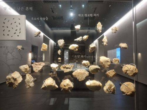 투명한 유리판에 '찍개' '긁개' 등 쓰임새가 다른 석기가 곶감이 매달린 것처럼 고정돼 있다(사진). 이전에는 진열장에 눕혀져 전시되던 석기를 이렇게 수직으로 세움으로써 얻는 전시 효과는 크다.